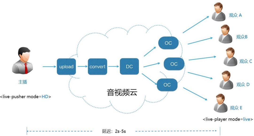 小程序中的 <live-pusher> 和 <live-player> 两个组件 ,都有一个叫做live ( <live-pusher> 中对应 mode 属性为 SD, HD, FHD)的模式,专门为在线直播而设计,通过小程序的音视频接口的live 模式,可以实现上述应用场景。