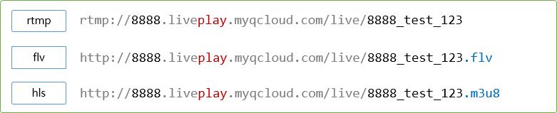 - step4:生成推流 url 和播放地址,推流一般都是 rtmp:// 打头的 url,而播放地址则有两种选择,分别是 “rtmp://” 开头的 rtmp 播放协议,“http://” 打头和“.flv”结尾的的 http-flv 播放协议,推荐使用后者,因为这种播放地址各个云厂商都优化的比较好。